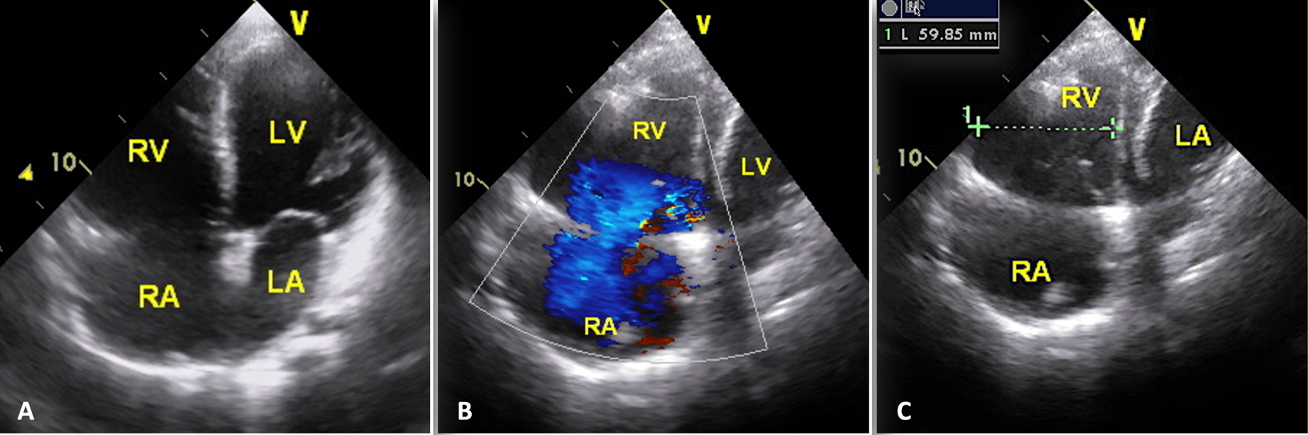 B: severe tricuspid regurgitation; C: apical 4-chamber view with RV dimension.