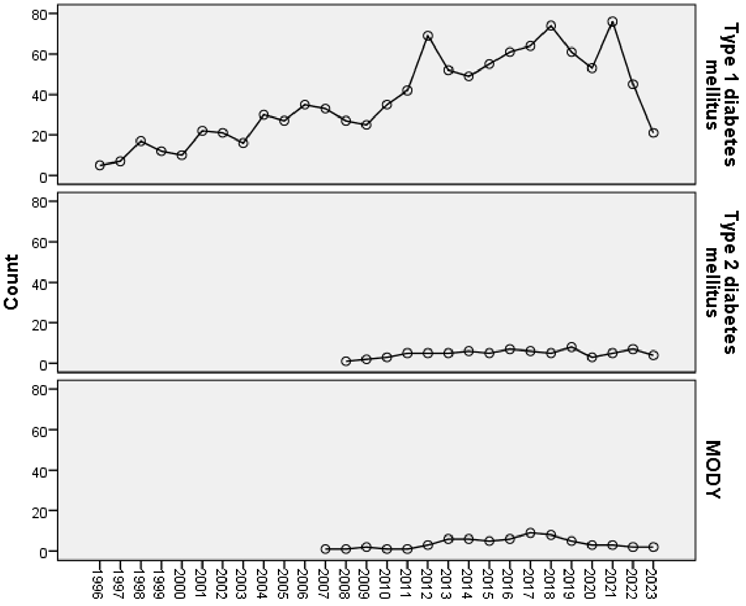 Methods. We conducted a comprehensive review of medical records of individuals aged 0–18 years who were diagnosed with diabetes between January 1996 and December 2023. Clinical and laboratory characteristics at the time of diagnosis, along with the specific diabetes type, were meticulously documented.