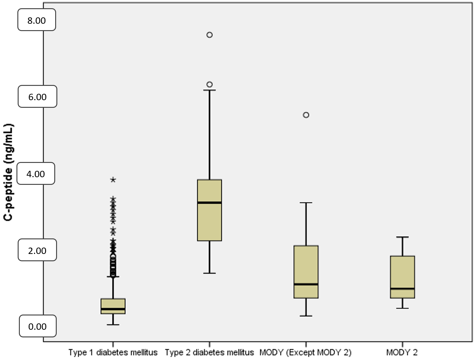 While glucose and HbA1c are very effective in diagnosis, they are not very helpful in differential diagnosis. While HbA1c is generally below 7.5% in MODY 2 and 8-9% in other MODYs, this rate is above 10% in type 1 diabetes.21 Similar results were found in our study; in general, HbA1c is higher in T1DM. In diagnosis, C-peptide level is more valuable than insulin level in demonstrating reserve, and a C-peptide level >1.2 ng/mL in diagnosis suggests T2DM or MODY.24 In our study, mean C-peptide level was 0.57 ng/mL and significantly low in T1DM, high in T2DM and moderate in MODY. In this study, there was little overlap in C-peptide levels at the time of diagnosis, especially in T1DM and T2DM, which helped us to differentiate these two types of diabetes. It also led us to distinguish T2DM from MODY, albeit weakly.