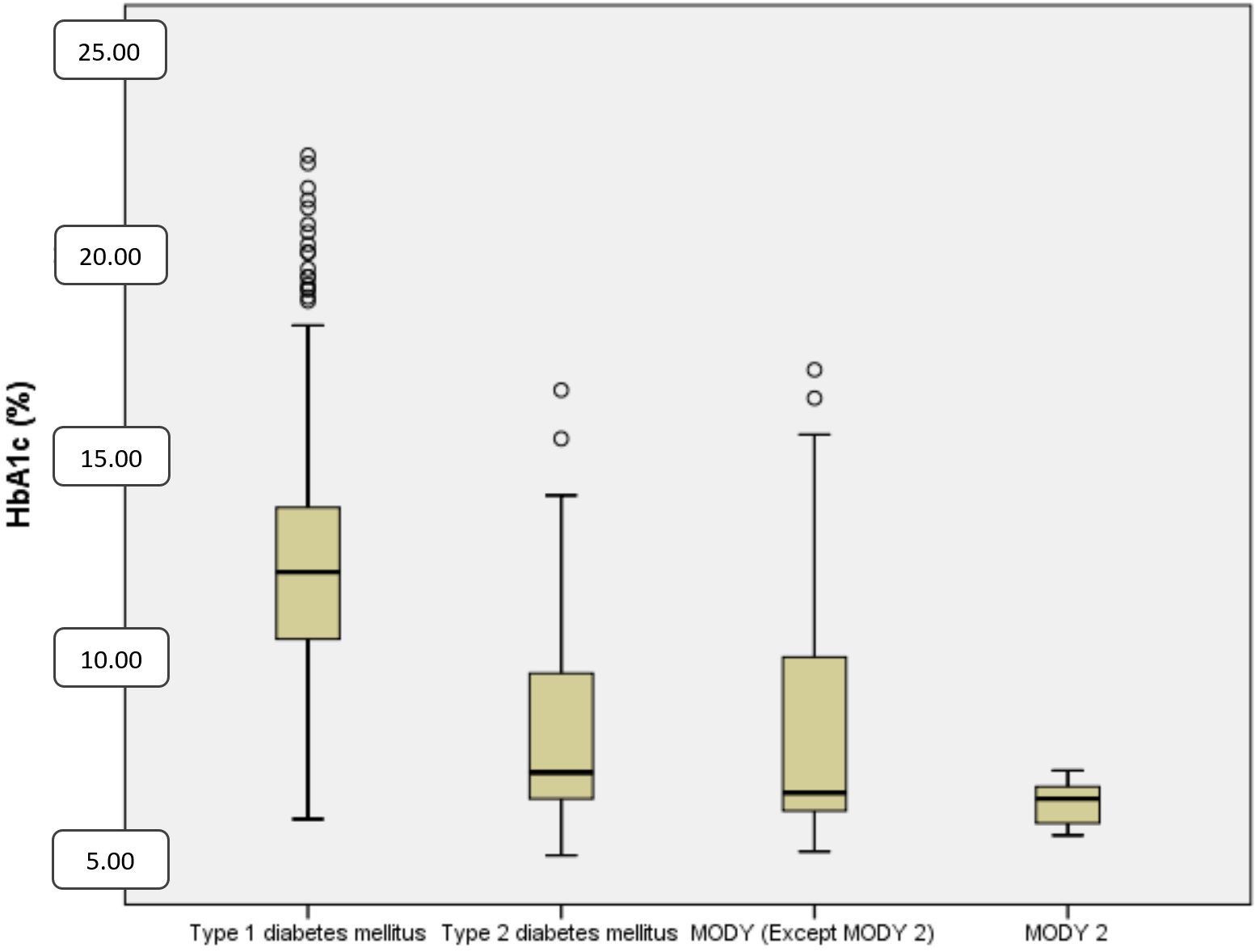 Mean C-peptide levels at diagnosis were 0.57±0.5 ng/mL in T1DM, 3.2±1.3 ng/mL in T2DM and 1.4±0.9 ng/mL in MODY patients (p<0.001) (Table II and Fig. 2). The mean HbA1c level at diagnosis was 12.2% ± 2.6% in T1DM, 8.1% ± 2.3% in T2DM and 7.6% ± 2.7% in MODY patients. HbA1c levels were significantly higher in T1DM (p<0.001) (Table II and Fig. 3).