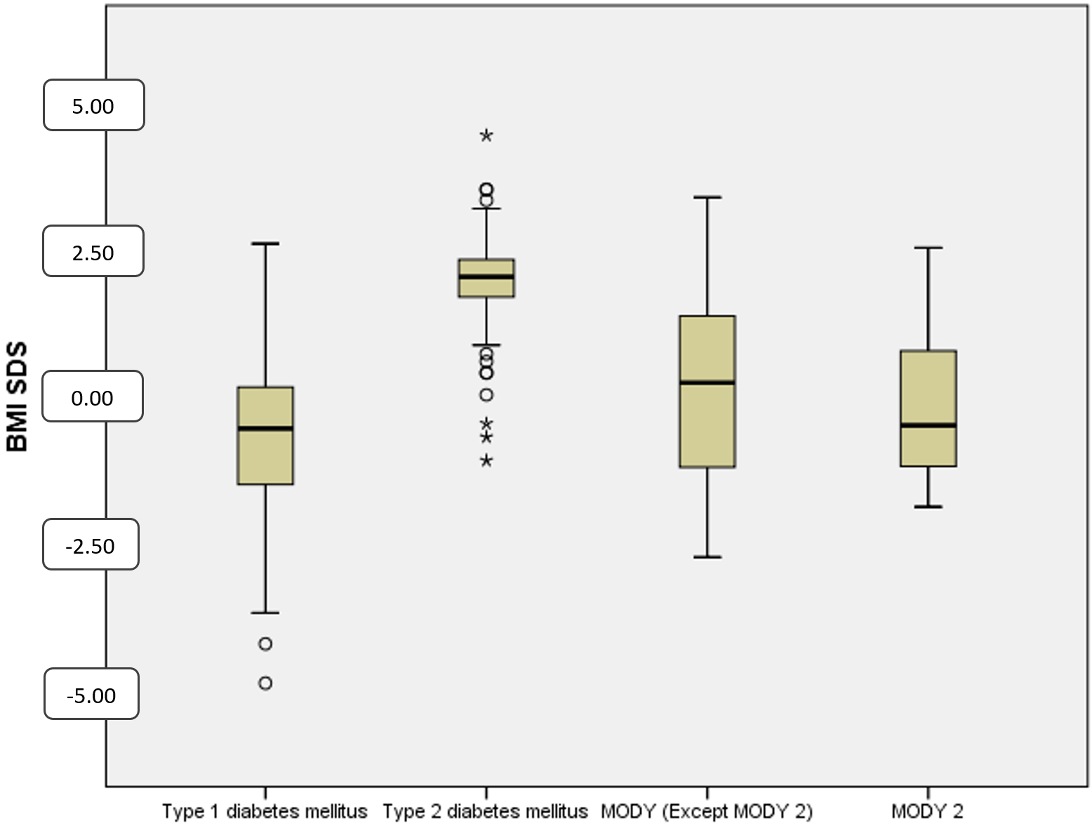 The median BMI-SDS at diagnosis was –0.5 (–1.5-0.1) in T1DM, 2.0 (1.6-2.3) in T2DM, and –0.2 (–1.2 -1.1) in MODY patients. It was found to be significantly higher in T2DM (p<0.001). Obesity was present 2% of T1DM, 10.9% of MODY and 93.7% of T2DM patients. Malnutrition was found in 13.6% of T1DM patients, 9.7% of MODY patients and was absent in T2DM patients (Table II and Fig. 4). Genetic analysis was available in 48 (75%) of 64 clinical MODY patients, and GCK mutations were detected in 27 (56.2%) patients.