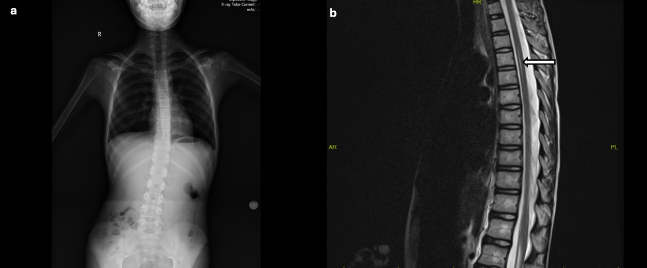 The patient, who had been previously followed by pediatric neurology, was noted to have borderline serum magnesium levels (1.7 mg/dL) approximately one year earlier, along with mildly elevated AST (51 IU/L) and ALT (45 IU/L) levels. Thyroid function tests; vitamin B12, folic acid, and 25-hydroxyvitamin D levels; carnitine-acylcarnitine analysis by tandem mass spectrometry; urinary organic acid analysis; and serum lactate, pyruvate, and ammonia levels were all within normal limits. Urinary, hepatobiliary, and suprapubic pelvic ultrasonography findings were normal. Scoliosis radiography confirmed thoracolumbar scoliosis (Fig. 1a). Brain MRI showed no abnormalities. Cervical MRI revealed loss of cervical lordosis, while thoracic MRI demonstrated a central syrinx in the spinal cord extending from the T3 to T6 levels (Fig. 1b).