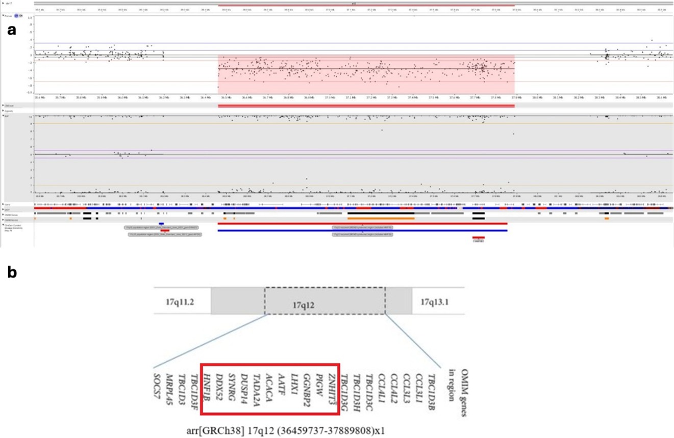 She was started on oral magnesium supplementation and referred to the medical genetics department for further evaluation. Chromosomal microarray analysis was performed on genomic DNA extracted from peripheral blood samples using the Qiagen DNA extraction kit (Qiagen, Hilden, Germany). Variant annotation was based on the GRCh38 (hg38) human genome reference, and interpretation followed the American College of Medical Genetics and Genomics (ACMG) standards. The analysis identified a heterozygous 1.4-Mb deletion at 17q12 (arr[GRCh38] 17q12(36459737_37889808)x1), encompassing several genes including HNF1B, PIGW (phosphatidylinositol-glycan biosynthesis class W protein), ACACA, LHX1 and ZNHIT3. The microarray profile is shown in Fig. 2a, and the schematic representation of all genes within this region is displayed in Fig. 2b.