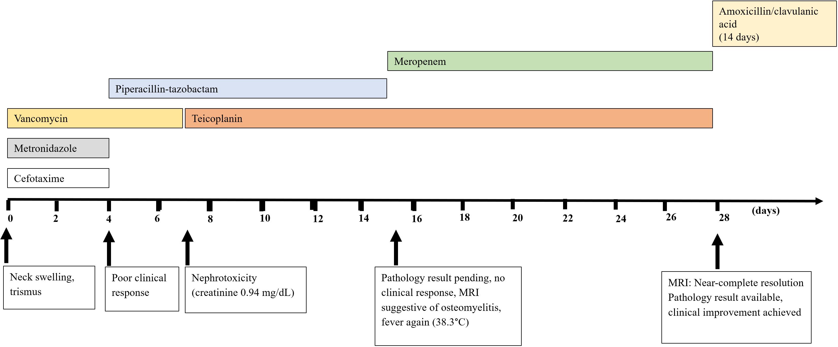 Case Presentation. A 15-year-old previously healthy male presented with painful neck swelling and trismus. Examination revealed a firm mass at the angle of the mandible. Imaging suggested osteomyelitis but raised concern for malignancy. Surgical drainage was performed, and histopathology confirmed actinomycotic infection. The patient initially received empirical intravenous vancomycin, cefotaxime, and metronidazole. Due to persistent fever and elevated inflammatory markers, the regimen was switched to teicoplanin plus piperacillin/tazobactam. Therapy was subsequently escalated to meropenem due to recurrent fever and based on magnetic resonance imaging findings suggestive of osteomyelitis, then vancomycin was replaced with teicoplanin because of vancomycin-associated nephrotoxicity. Following clinical improvement, the patient was discharged on oral amoxicillin/clavulanate to complete a total of six weeks of therapy.