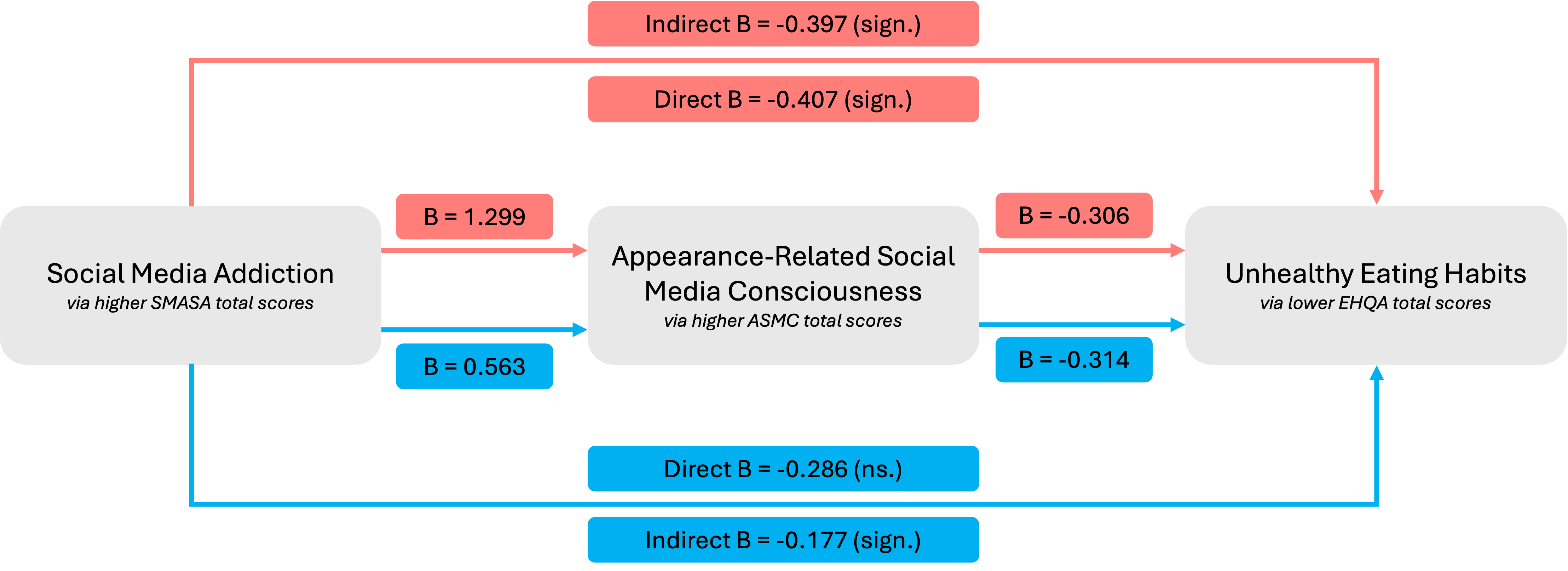 Methods. A cross-sectional survey was conducted with 487 high school students aged 14–18 years in Manavgat, Antalya, Türkiye. Measures included the Social Media Addiction Scale for Adolescents (SMASA), Social Media Disorder Scale (SMDS), Appearance-Related Social Media Consciousness Scale (ASMC), Scale of Effects of Social Media on Eating Behavior (SESMEB) and Eating Habits Questionnaire for Adolescents (EHQA). Non-parametric tests were used due to non-normal data distributions; gender-stratified multiple regression models identified independent predictors of unhealthy eating habits. Simple mediation analyses (PROCESS Model 4) were performed to test indirect effects, as mediation models allow evaluation of whether ASMC explains the pathway between social media–related variables and unhealthy eating.