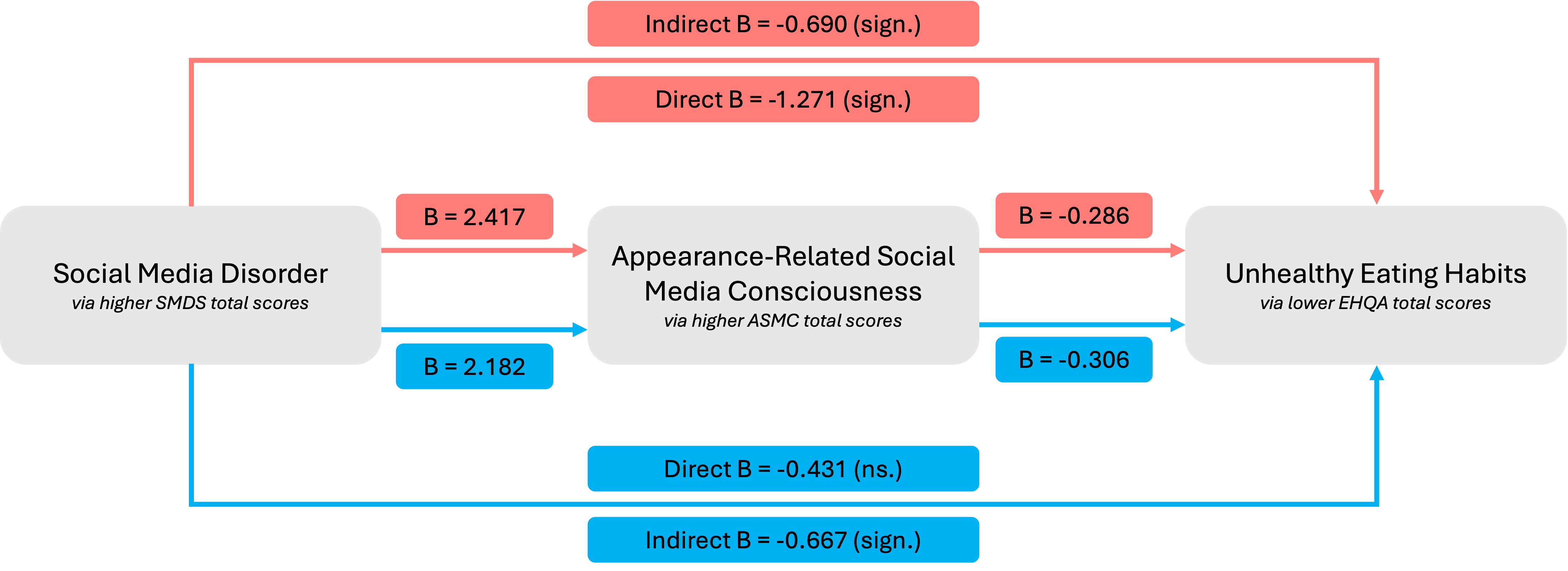 H2. Appearance-related social media consciousness will mediate the associations between social media addiction and social media disorder and unhealthy eating behaviors.