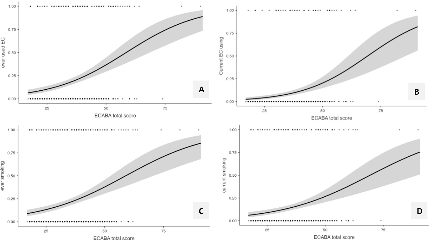 Association between ECABA Scale scores and e-cigarette use/smoking