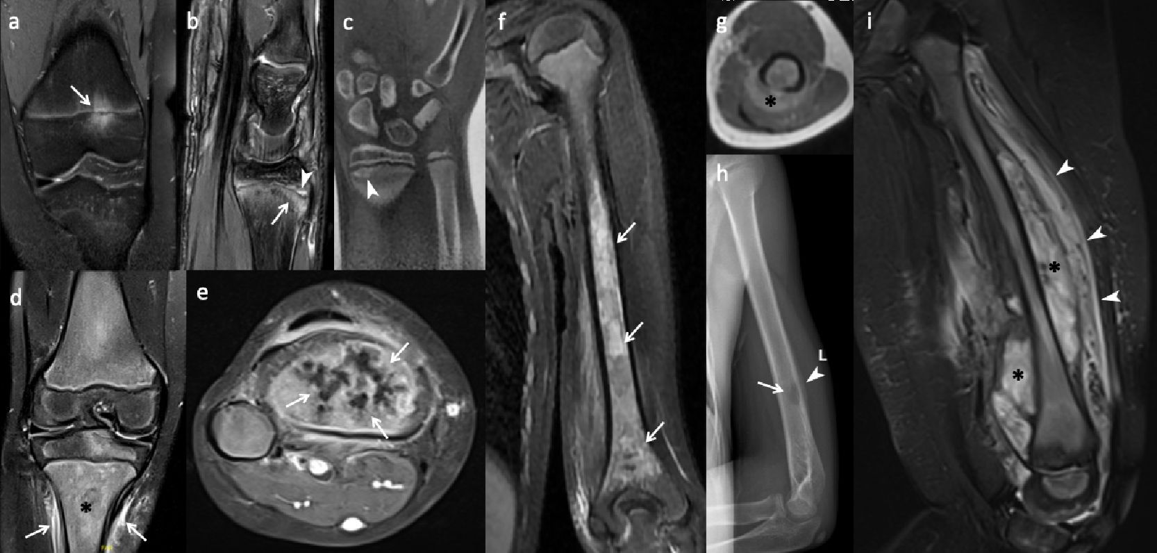 Normal variants of bone marrow, such as red marrow in the metaphysis during childhood and residual red bone marrow foci in the feet, should not be misinterpreted as osteitis (Fig. 4d). Focal periphyseal edema (FOPE) is another incidental finding located around the physis during the physeal closure period (Fig. 4a). Bone contusions, physeal stress injuries, stress fractures, or reactions may result in or associated with osteitis, but history of trauma—either acute or chronic—and the location of these lesions can help differentiate them from CNO (Fig. 4b, 4c). Hematogenous osteomyelitis can also mimic osteitis in CNO, but in addition to the patient’s history, physical examination, and laboratory findings, the presence of an abscess inside the bone and surrounding soft tissue, heterogeneous enhancement of bone marrow, and localized disease (as opposed to multifocal lesions) can aid in differentiation between these two entities (Fig. 4d, 4e). Neoplastic, infiltrative, or metastatic bone lesions, such as Ewing sarcoma, Langerhans cell histiocytosis, and leukemia, can pose diagnostic challenges; however, factors such as the patient’s age, the presence of an extraosseous solid soft tissue component of the tumor, abrupt lesion contour, and lesion location and shape are key features to consider when evaluating these pathologies (Fig. 4f‒h). Scurvy, as a metabolic condition, is another mimicker that presents with metaphyseal osteitis. However, subperiosteal hemorrhages are not seen in CNO (Fig. 4i).33,54